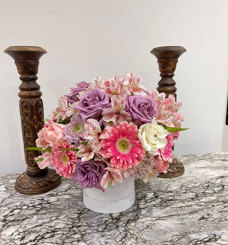 Vibrante y lleno de textura, el diseño Cariño fusiona la energía de las gerberas con la elegancia de las rosas y el toque delicado de la chabela. Un arreglo diseñado con follaje Roxana en tonos rosas y magentas, perfecto para transmitir un mensaje cálido, alegre e inolvidable.