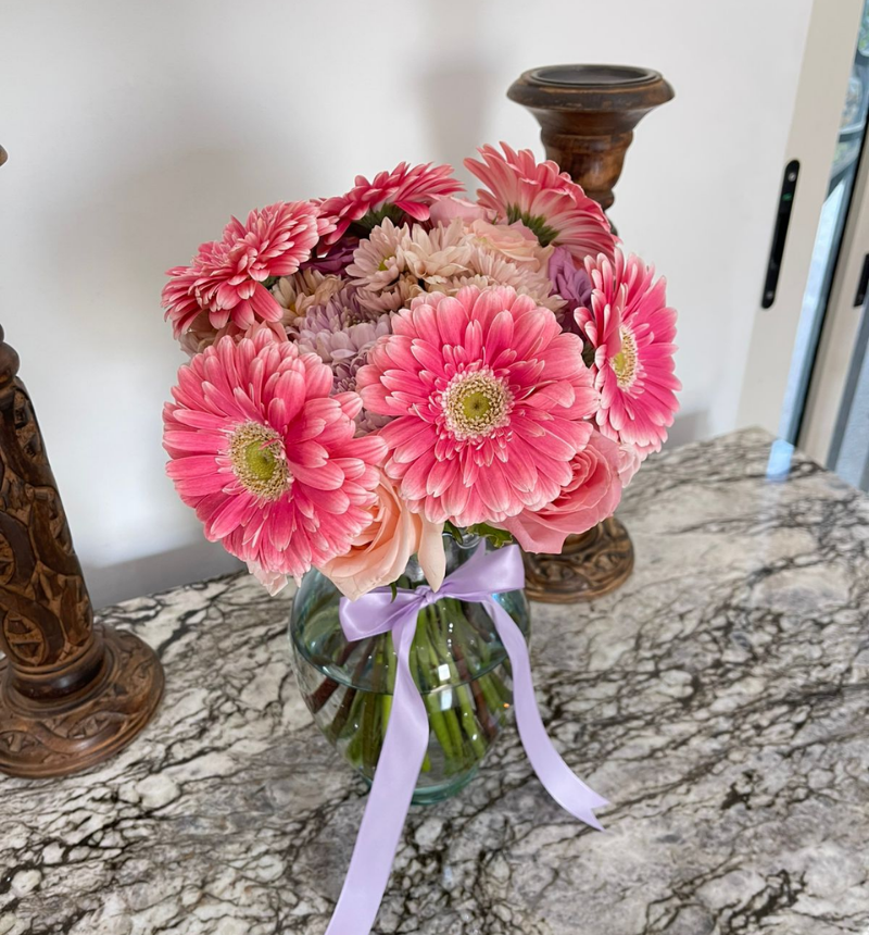 El arreglo Cariño es una celebración del amor en su forma más alegre. Su combinación de gerberas, rosas premium, mini rosas y chabelas crea un diseño lleno de vida, volumen y movimiento, evocando la belleza de un jardín en flor especialmente para mamá.