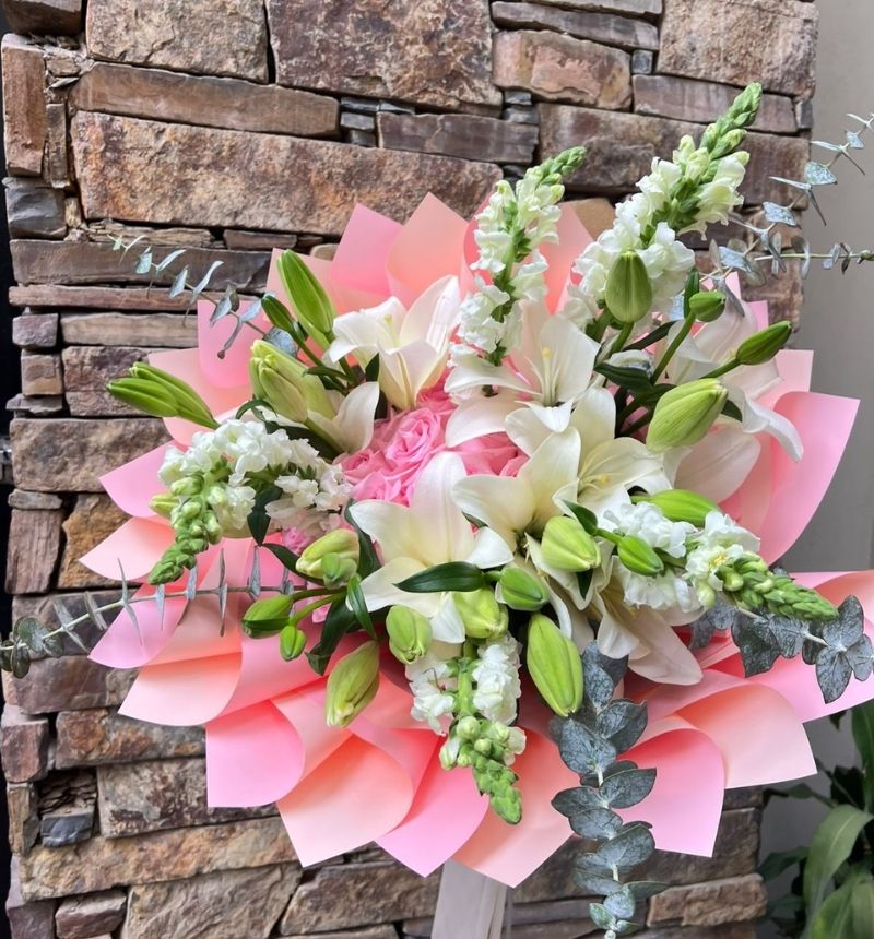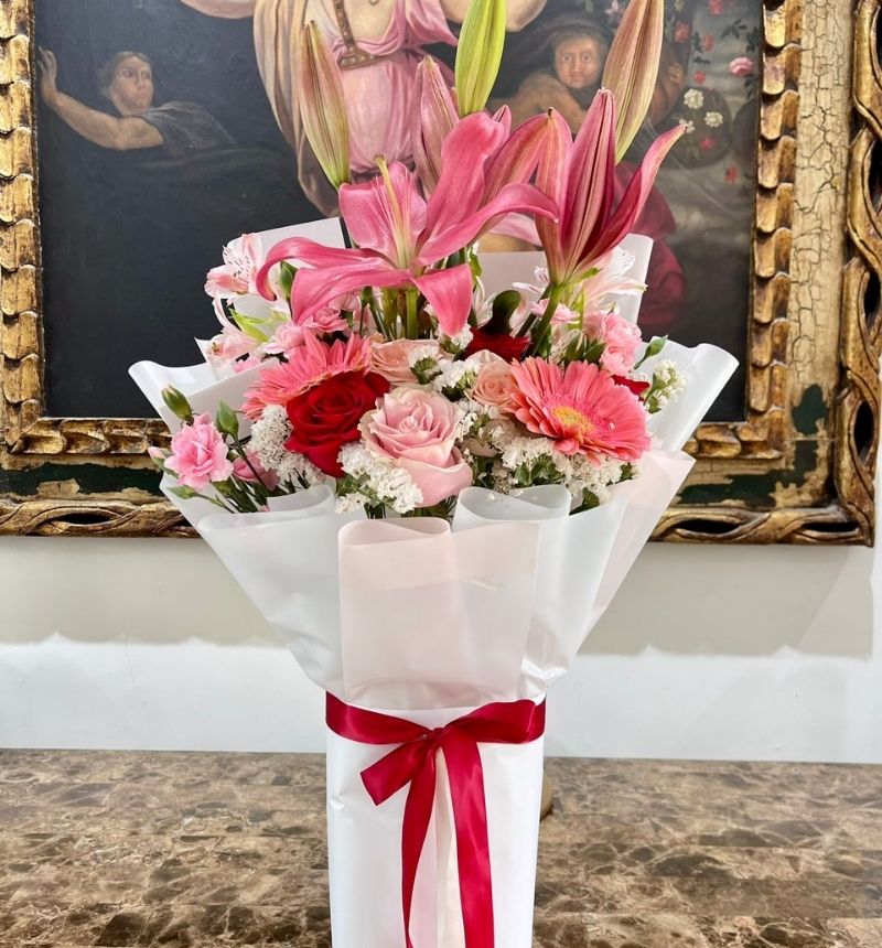 El Bouquet Liora es una sinfonía de texturas y colores vibrantes. Este diseño premium combina la elegancia escultural de las lilies con la delicadeza de las rosas y la estructura radial de las gerberas. El toque distintivo lo aportan las clavelinas, que añaden un volumen suave y romántico, mientras que los follajes en tonos olivo equilibran la intensidad de los rojos y rosas profundos, creando una experiencia visual equilibrada y sofisticada.